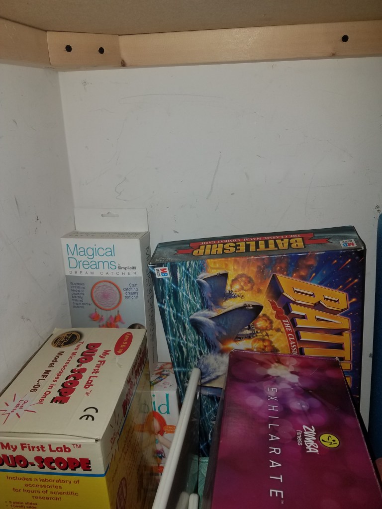 And yes, just to be clear, not all of the empty boxes shown were originally on the shelf you’ll see below (Monopoly is too wide to fit) and there were other games in the shelf that haven’t been pictured yet. I haven’t shown you my extended game storage I had to create near the ceiling. That game storage area still exists, but it looks so much better, as you’ll also see below. Now I need to unload everything else in this mini bookcase-thing (DVDs and video games) to lower the shelves!