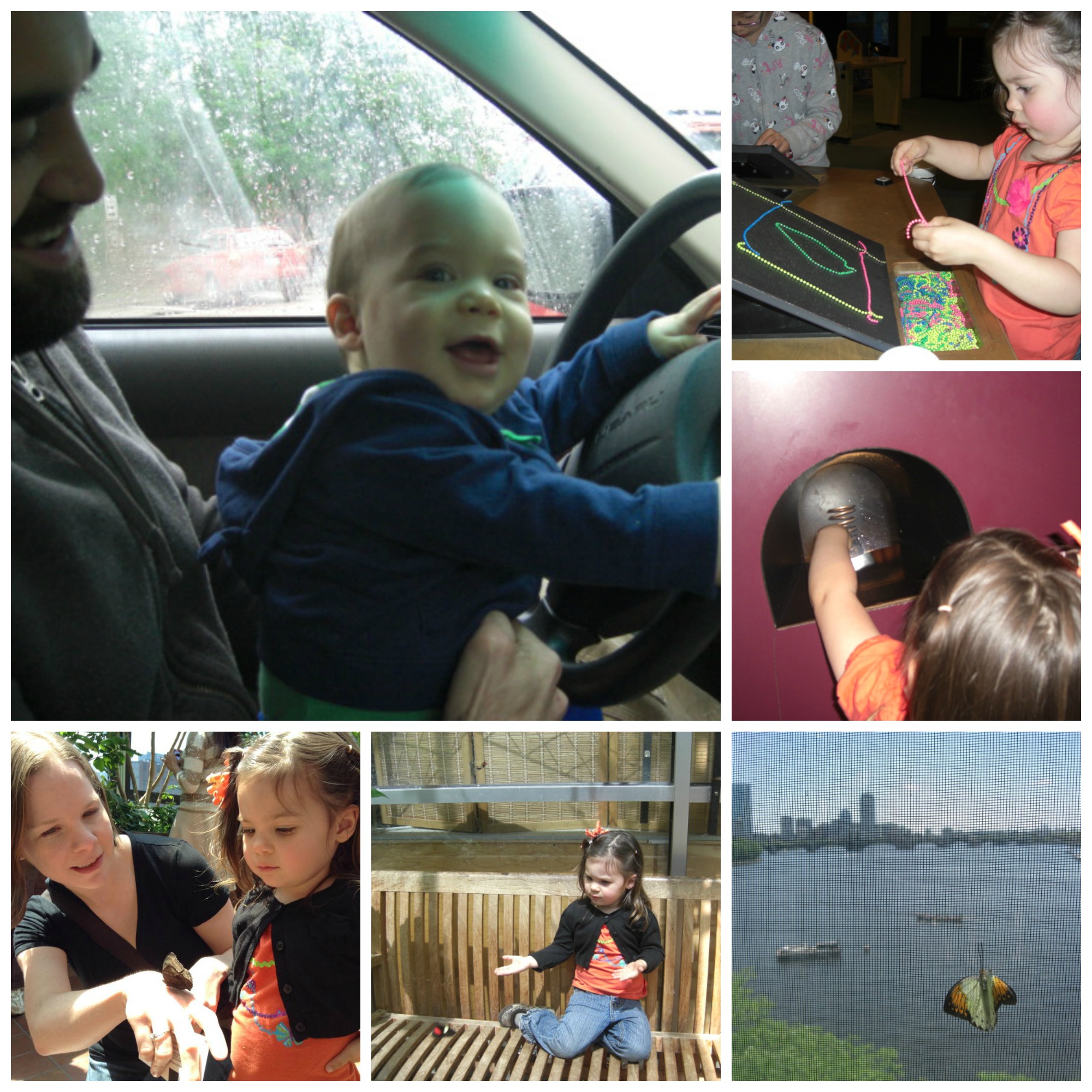 Clockwise from top left: 1. Don’t worry, the baby was “driving” at a rest stop. 2. O started with a green elephant then said she was building a house around him. 3. Have you seen these optical illusions where the object looks like you can grab it? 4. The view from inside the Butterfly exhibit. 5. Waiting patiently for butterflies. 6. Mommy had a brown butterfly land on her the moment we walked in.