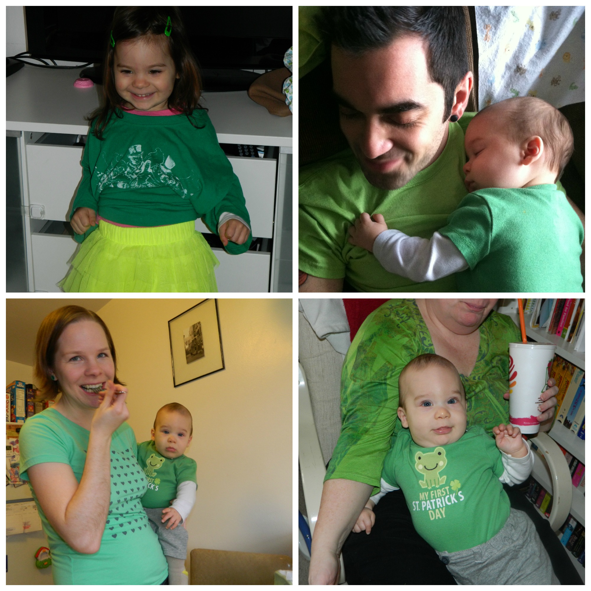 The second part of my awesome St. Patrick’s Day plan was fancy green food and, to up the ante, I forbid myself from using any food coloring. Easy? Me? Never! So, we all started the morning with spinach cheddar chive scones from this recipe by Weelicious (I didn’t tamper with the coffee under penalty of death). Lunch was spinach salads with mandarin orange slices. And for dinner, we had green cheese-filled tortellini with pesto sauce (in green bowls, of course) and a side of peas. O was not pleased with “too much pepper” on her pasta so we had to make it “clean” before she’d touch it. After we washed the tortellini off though (and wasted all that yummy pesto, as Grandma Mimi moaned), she ate it happily. Our Little Frog had some delicious spinach baby food (how does he manage to get it everywhere?! We require an outfit change after every meal; the bib is worthless).